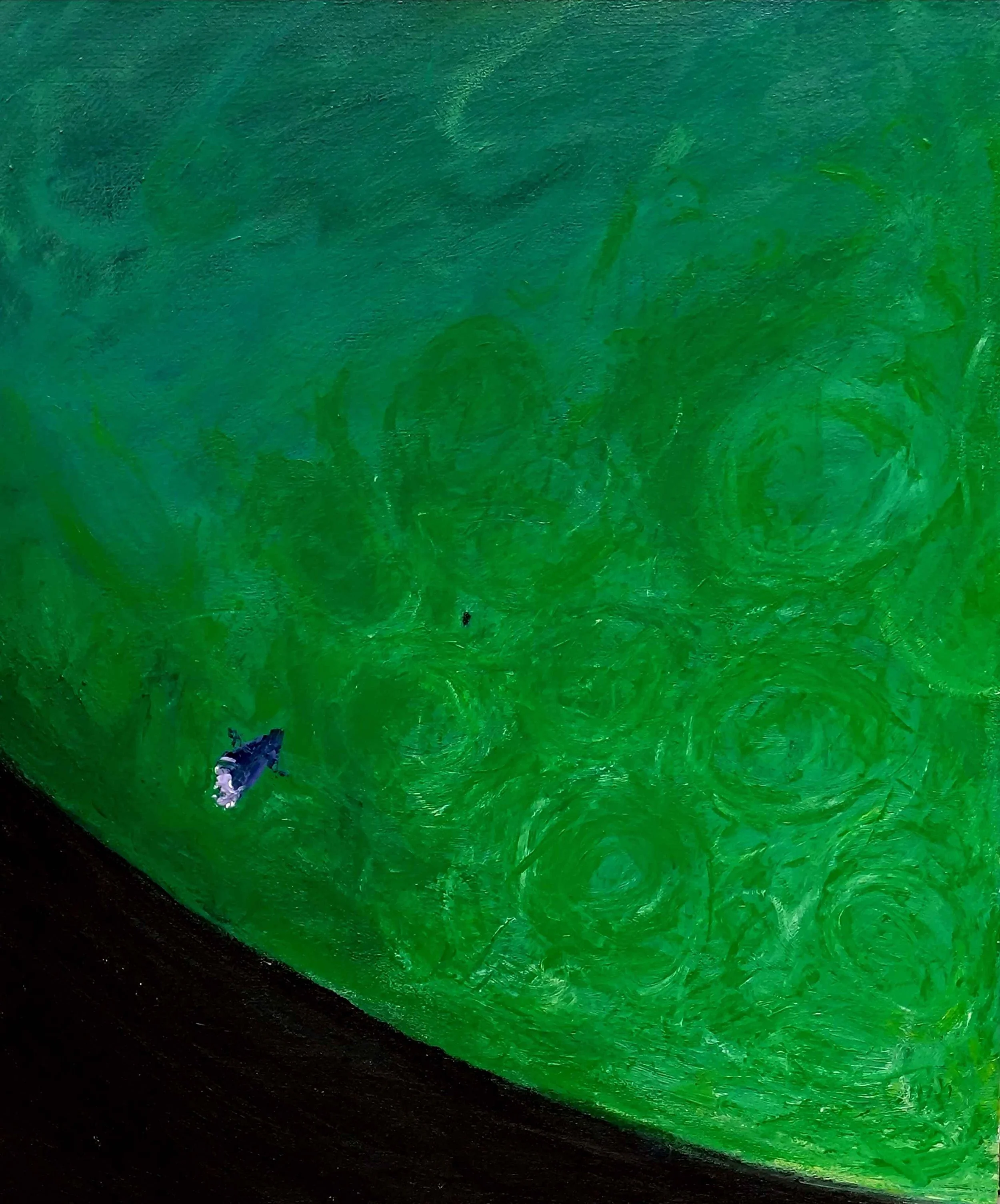 Description: Wet-on-wet acrylic on linen canvas; assignment for my studies. To convey the feeling of simultaneous admiration of a magical sight, and cosmic dread at the mercy of monstrously enormous forces.